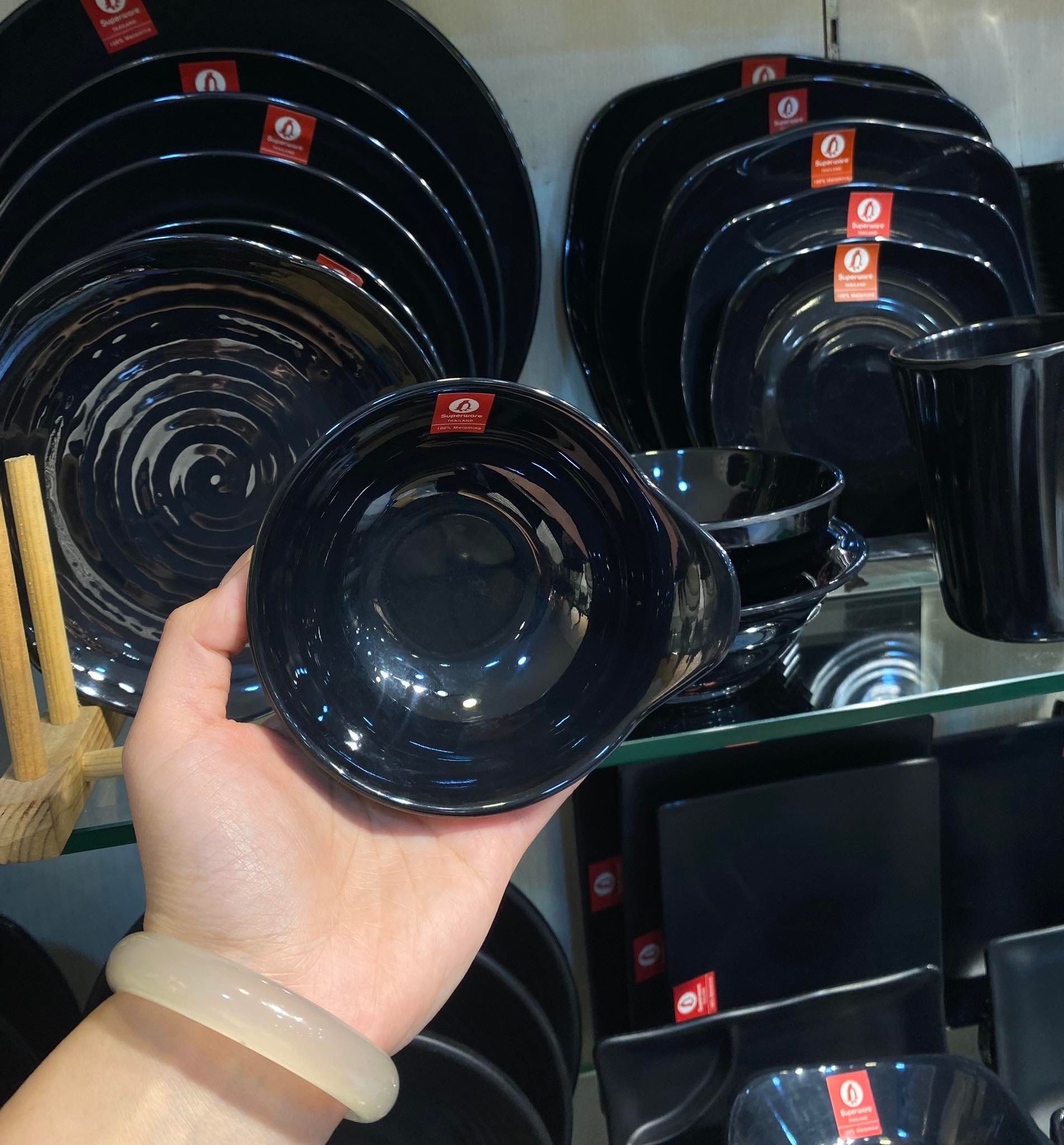 Dòng bát, đĩa được sản xuất từ nhựa Melamine là sự kết hợp hoàn hảo giữa những đặc tính tốt nhất của nhựa và sứ. Vì thế, Bát, đĩa, tô, khay gia vị, cốc Melamine Superware nhìn như bát, đĩa sứ nhưng lại có trọng lượng nhẹ nhàng, khó sứt mẻ, khó trầy xước, không bám màu. Hơn nữa, bề mặt đĩa mang lại sự sang trọng, tinh tế và đẳng cấp khác biệt cho bàn ăn của bạn. Chính vì vậy, bộ sản phẩm bát đĩa Melamine đen bóng được sử dụng phổ biến trong rất nhiều khách sạn cao cấp, nhà hàng buffet lẩu nướng, nhà hàng theo phong cách Nhật Bản, Hàn Quốc.