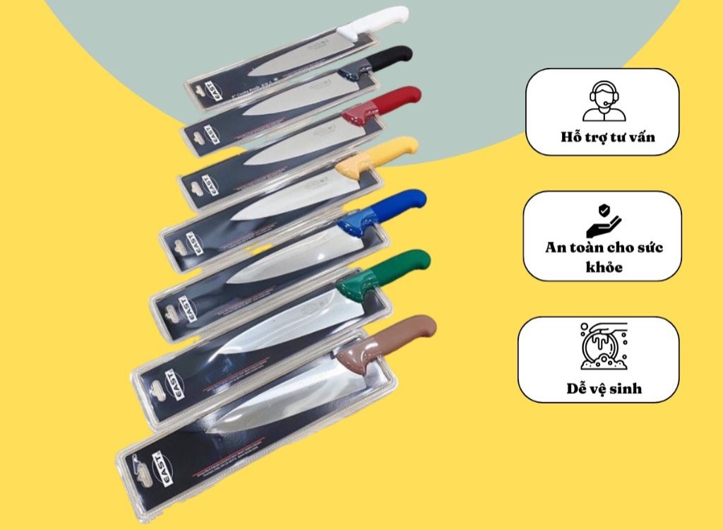 + Cán dao bằng nhựa: (7 màu) - Đỏ, Xanh dương, Xanh lá, Nâu, Vàng, Trắng, Đen (Màu sắc cán dao phụ thuộc vào màu thớt). Mỗi màu là tượng trưng cho 1 thực phẩm theo tiêu chuẩn nhà bếp .