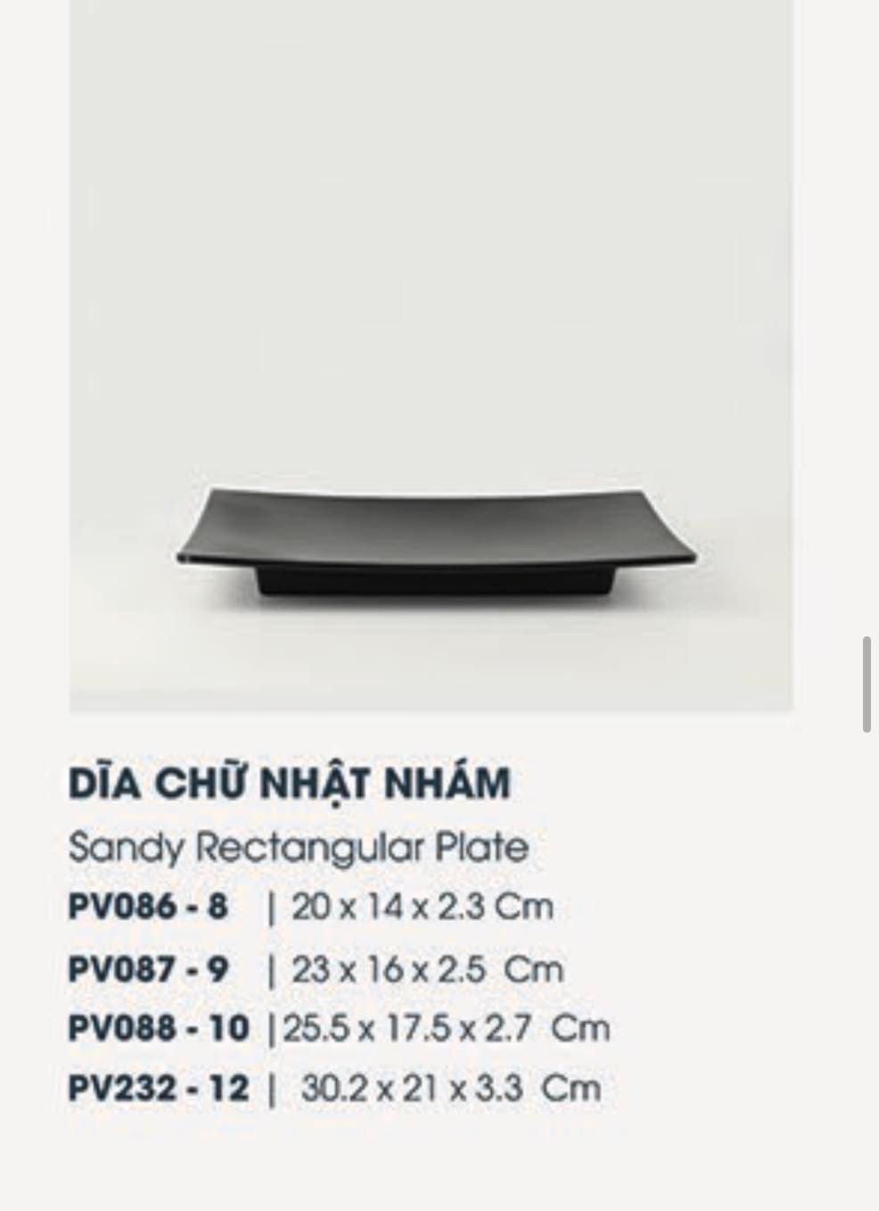 Đĩa chữ nhật đen nhám có kích cỡ to nhỏ phù hợp cho mọi món ăn: