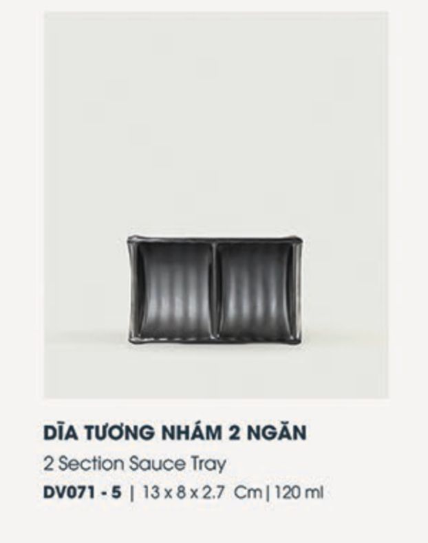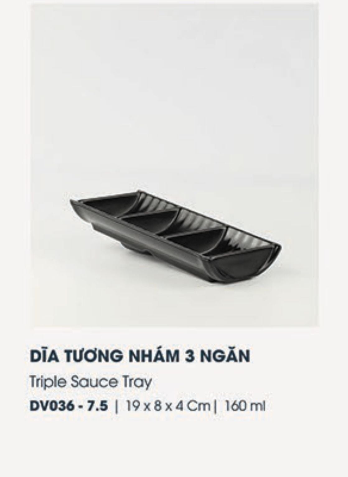 Đĩa tương nhựa melamine Thái Lan 2 ngăn, 3 ngăn màu đen nhám với thiết kế đơn giản nhưng lại khá bắt mắt và không kém phần tiện lợi. Đĩa tương với 2 ngăn,3 ngăn phù hợp để sử dụng trong các bàn tiệc ngoài trời, nhà hàng nướng lẩu.