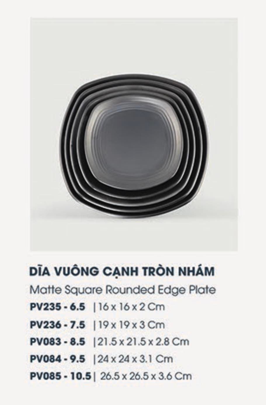 Đĩa vuông cạnh tròn nhám Melamine Thái Lan đen nhám có 5 kích cỡ to nhỏ phù hợp cho mọi món ăn: