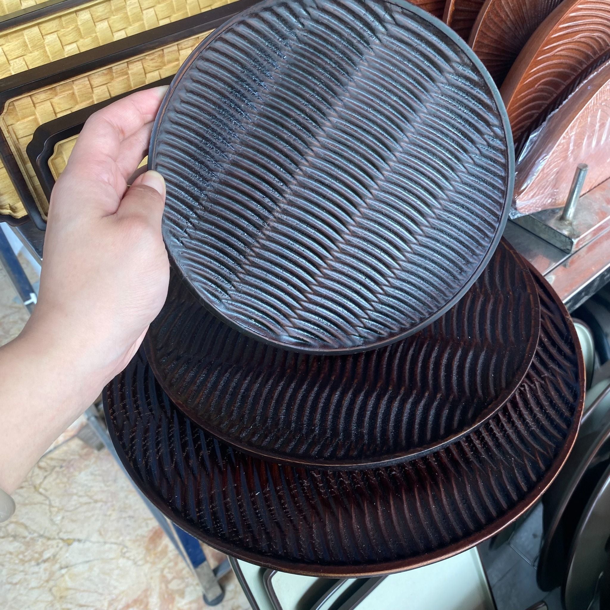 Khay gỗ tròn Decor trạm khắc giả mây